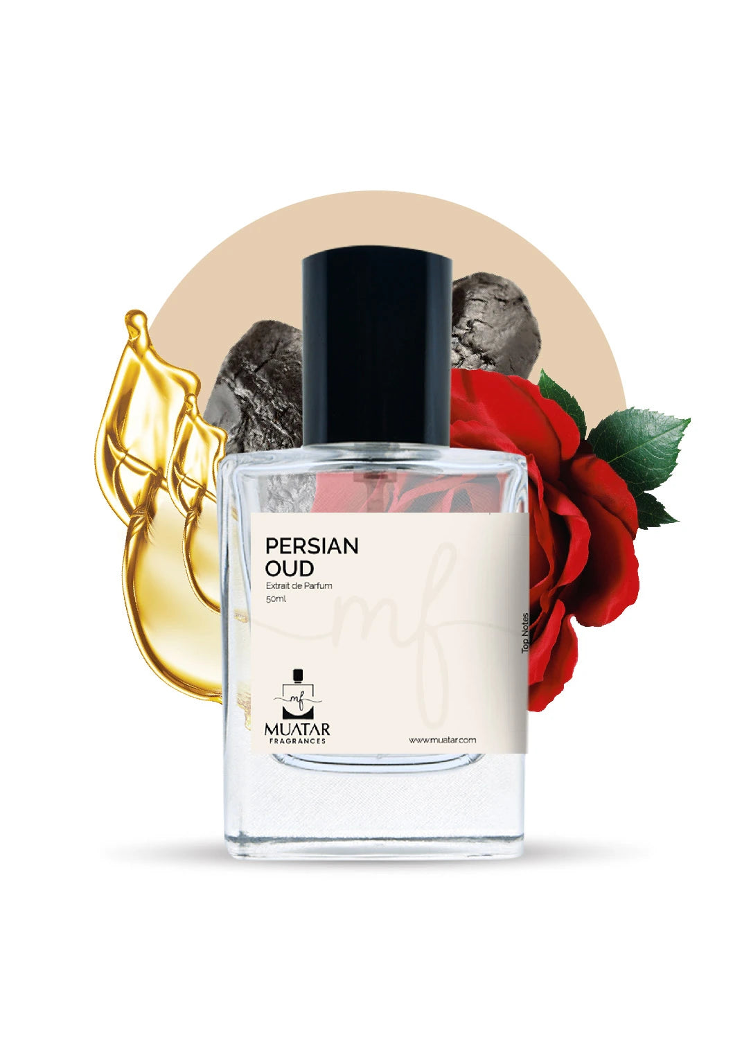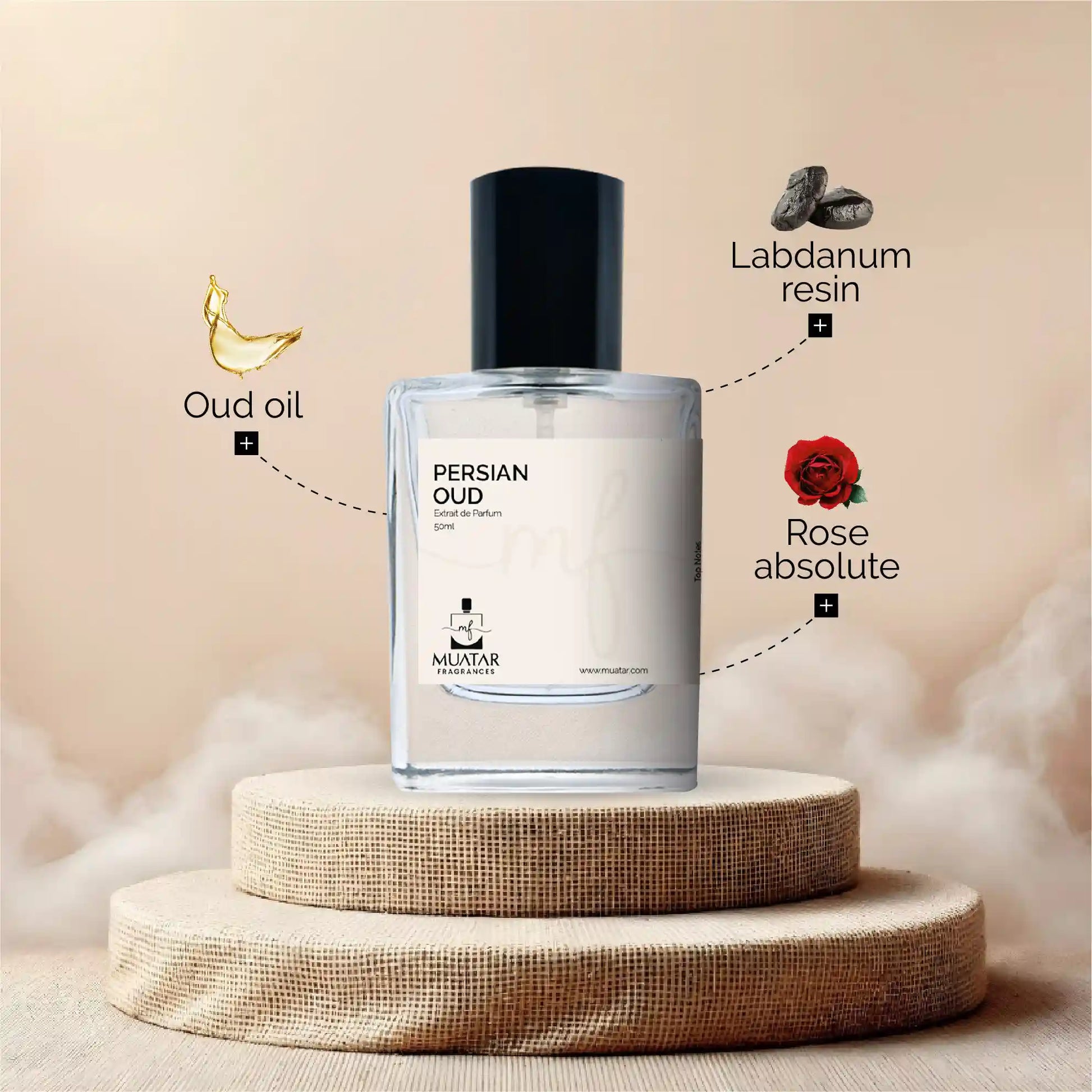 A Middle Eastern‑inspired oriental woody with a rose and pink pepper opening; a heart of agarwood (oud) and labdanum; and a warm base of patchouli, benzoin, and amber—sumptuous and richly textured.